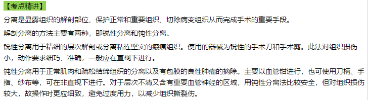 1.【答案及解析】C。鈍性分離用于正常肌肉和疏松結締組織的分離以及有包膜的良性腫瘤的摘除。主要以血管鉗進行,也可使用刀柄、手指、紗布等,可在非直視下進行。