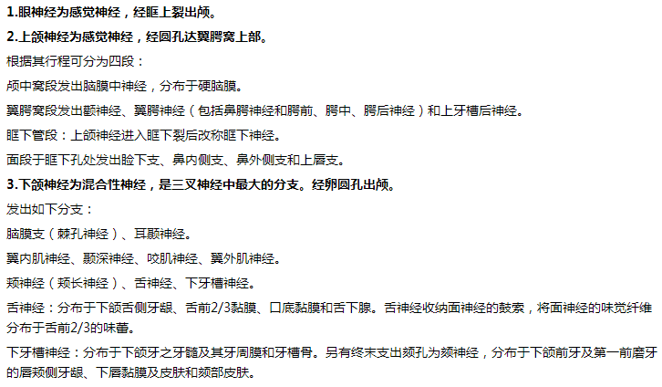 三叉神經(jīng)屬混合性神經(jīng),是口腔頜面部主要的感覺(jué)神經(jīng)和咀嚼肌的運(yùn)動(dòng)及本體感覺(jué)神經(jīng)。三條分支分別為眼神經(jīng)、上頜神經(jīng)和下頜神經(jīng)。
