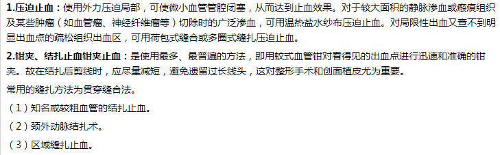 止血方法包括:壓迫止血,鉗夾、結(jié)扎止血,藥物止血,電凝止血,低溫止血和降壓止血。