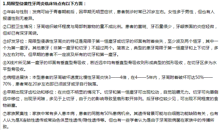 侵襲性牙周炎按其患牙的分布可分為局限型和廣泛型。具有一些共同的臨床表現(xiàn):①菌斑堆積量與牙周組織破壞的嚴重程度不相符;②伴放線聚集桿菌比例升高,在一些人群中牙齦卟啉單胞菌比例可能升高;③吞噬細胞異常;④巨噬細胞過度反應,包括PGE2和IL-1β水平升高;⑤附著喪失和牙槽骨吸收有自限性。
