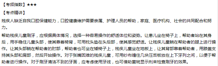 2.【答案及解析】C。對(duì)于張嘴困難的殘疾兒童,可用紗布纏住幾塊壓舌板放在上下牙列之間,以便于幫助者進(jìn)行操作。對(duì)于刷牙清潔不到的牙面,應(yīng)考慮使用牙線,也可借助菌斑顯示劑來檢查刷牙的效果。