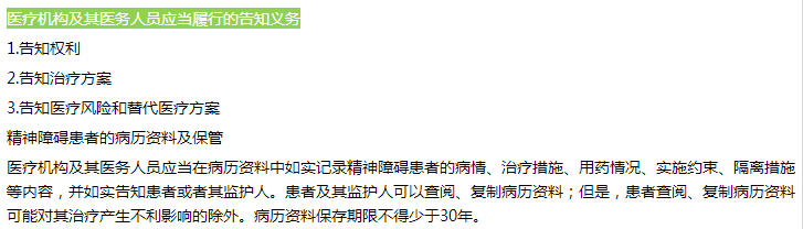 2.出院:自愿住院治療的精神障礙患者可以隨時要求出院,醫(yī)療機(jī)構(gòu)應(yīng)當(dāng)同意。對已經(jīng)發(fā)生傷害自身的行為,或者有傷害自身的危險情形的精神障礙患者實(shí)施住院治療的,監(jiān)護(hù)人可以隨時要求患者出院,醫(yī)療機(jī)構(gòu)應(yīng)當(dāng)同意。醫(yī)療機(jī)構(gòu)認(rèn)為上述情形的精神障礙患者不宜出院的,應(yīng)當(dāng)告知不宜出院的理由;患者或者其監(jiān)護(hù)人仍要求出院的,執(zhí)業(yè)醫(yī)師應(yīng)當(dāng)在病歷資料中詳細(xì)記錄告知的過程,同時提出出院后的醫(yī)學(xué)建議,患者或者其監(jiān)護(hù)人應(yīng)當(dāng)簽字確認(rèn)。