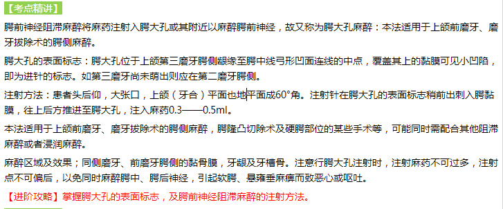 2.【答案及解析】A。腭前神經(jīng)阻滯麻醉,患者頭后仰,大張口,上頜(牙合)平面也地平面成60°角。注射針在腭大孔的表面標志稍前出刺入腭黏膜,往上后方推進至腭大孔,注入麻藥0.3——0.5ml。