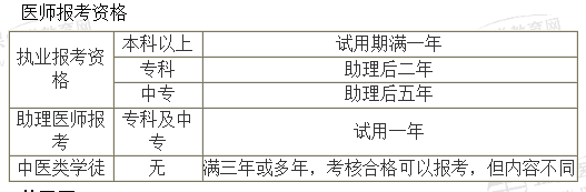 【答案解析】 執(zhí)業(yè)醫(yī)師資格考試條件:具有下列條件之一的,可以參加執(zhí)業(yè)醫(yī)師資格考試:①具有高等學(xué)校醫(yī)學(xué)專業(yè)本科以上學(xué)歷,在執(zhí)業(yè)醫(yī)師指導(dǎo)下,在醫(yī)療、預(yù)防、保健機(jī)構(gòu)中試用期滿1年的;②取得執(zhí)業(yè)助理醫(yī)師執(zhí)業(yè)證書(shū)后,具有高等學(xué)校醫(yī)學(xué)專科學(xué)歷,在醫(yī)療、預(yù)防、保健機(jī)構(gòu)中工作滿2年;具有中等專業(yè)學(xué)校醫(yī)學(xué)專業(yè)學(xué)歷,在醫(yī)療、預(yù)防、保健機(jī)構(gòu)中工作滿5年的。