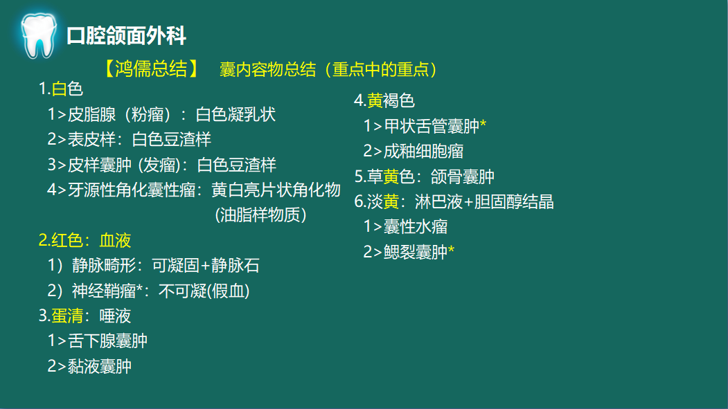 口腔頜面外科中有關于囊內容物的特點在口腔外科中屬于重點中的重點,在每年考試中又占有一定的分值。因現(xiàn)在考試多考查病例分析類的題目,因此掌握囊內容的特點,在病例分析類題目中可以幫助快速診斷相應疾病,順利拿分。