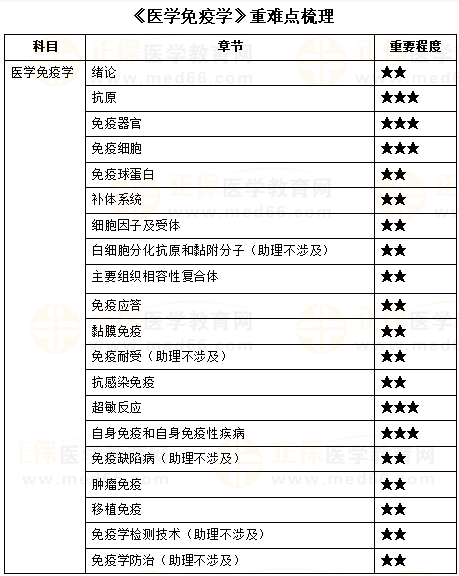 醫(yī)學(xué)免疫學(xué)作為醫(yī)學(xué)基礎(chǔ)學(xué)科中重要的一個(gè)科目,篇幅較大,內(nèi)容豐富,但醫(yī)師考試中所有占比重較少,約占總題量1%,通過(guò)系統(tǒng)復(fù)習(xí)可剖析出部分得分點(diǎn),提高得分。由于考題較少,不宜強(qiáng)求得分,可根據(jù)個(gè)人復(fù)習(xí)情況選擇性學(xué)習(xí)。