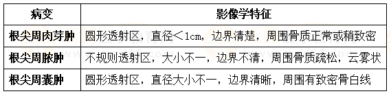 根尖X線片顯示,根尖周病變呈圓形,直接小于1cm,邊界清楚,周圍骨質(zhì)正常,屬于