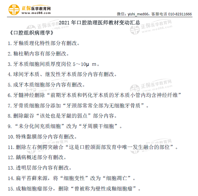 關(guān)于“2021年口腔執(zhí)業(yè)助理筆試教材變動(dòng)細(xì)則-《口腔組織病理學(xué)》”,相信很多考生十分關(guān)注,醫(yī)學(xué)教育網(wǎng)編輯分享具體變動(dòng)內(nèi)容如下: