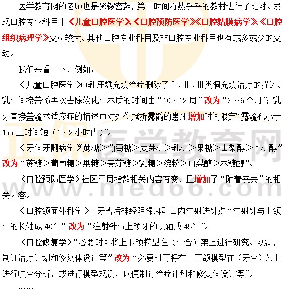 從小編的舉例可以看出,整本書中口腔專業(yè)課的內(nèi)容編寫得更加精簡且嚴謹,而對于有些操作,更為細節(jié)化。總體而言,新的教材描述更貼近臨床,這也意味著2022年考試更趨向細節(jié),難度會有所增加。我們醫(yī)學教育網(wǎng)憑借多年的培訓經(jīng)驗,透析近年來的考情狀況,深入分析考察方向,不斷為大家提供符合新版教材的課程、題庫。立即跟著網(wǎng)校課程開啟新一年備考吧!查看課程>>