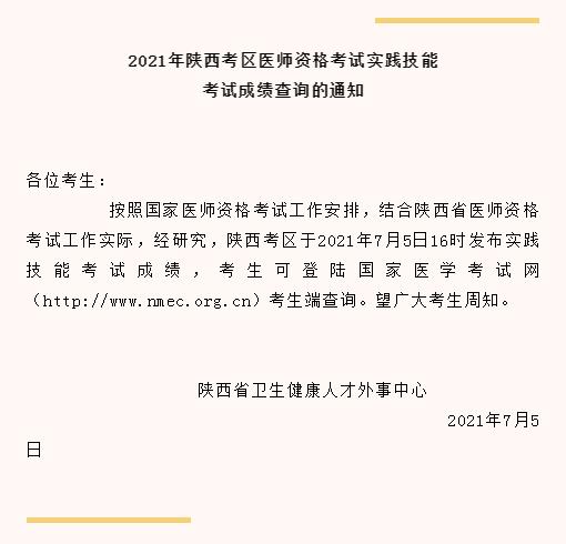 按照國(guó)家醫(yī)師資格考試工作安排,結(jié)合陜西省醫(yī)師資格考試工作實(shí)際,經(jīng)研究,陜西考區(qū)于2021年7月5日16時(shí)發(fā)布實(shí)踐技能考試成績(jī),考生可登陸國(guó)家醫(yī)學(xué)考試網(wǎng)(http://www.nmec.org.cn)考生端查詢。望廣大考生周知。