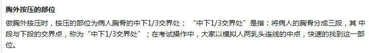 2.做胸外按壓時,兩手掌根部重疊于胸骨中、下1/3交界處;要求: