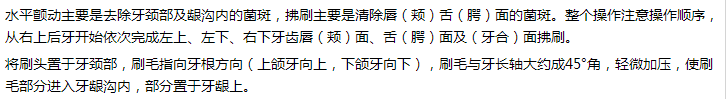 牙刷放置牙位一般占2——3顆牙的距離。每個位置刷5——10次,然后移至下1個鄰牙位置,2個刷牙位置之間應(yīng)有重疊。