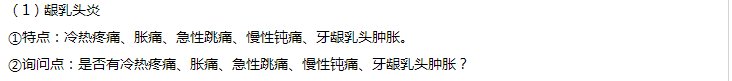 ②詢問點(diǎn):是否有急性跳痛、慢性鈍痛、咬物疼痛、牙齦出血、牙齒松動(dòng)移位?