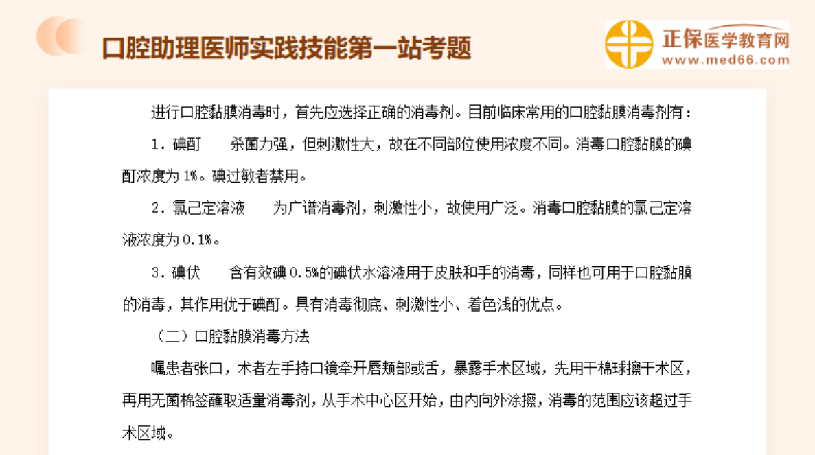 醫(yī)學(xué)教育網(wǎng)編輯整理分享“口腔助理醫(yī)師實(shí)踐技能【口腔檢查】??碱}:口腔黏膜消毒”如下,希望可以幫助大家更好地掌握相關(guān)重點(diǎn)!