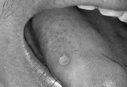 患者,男,32歲,某企業(yè)骨干,已婚。因反復(fù)發(fā)生口腔潰爛前來就診。自述口腔反復(fù)發(fā)生口腔潰瘍2年余,其部位不斷變化,發(fā)作間隙為2~4周,發(fā)作時疼痛難忍,影響進食,潰瘍8到10天左右愈合。近4天舌部出現(xiàn)潰瘍,疼痛明顯,工作壓力大,晚上休息差??谇粰z查:舌部右側(cè)緣有一直徑約2mm的表淺潰瘍,周邊紅,潰瘍表面覆蓋淡黃色假膜,潰瘍面微凹陷,觸痛明顯。口內(nèi)其他檢查未見異常。病損檢查情況見下圖: