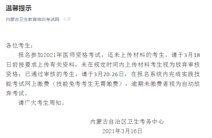 2021年口腔執(zhí)業(yè)助理醫(yī)師考試內(nèi)蒙古考區(qū)實(shí)踐技能網(wǎng)上繳費(fèi)3月20日開(kāi)始!具體截止時(shí)間、繳費(fèi)方式及注意事項(xiàng)醫(yī)學(xué)教育網(wǎng)小編為大家整理具體通知如下: