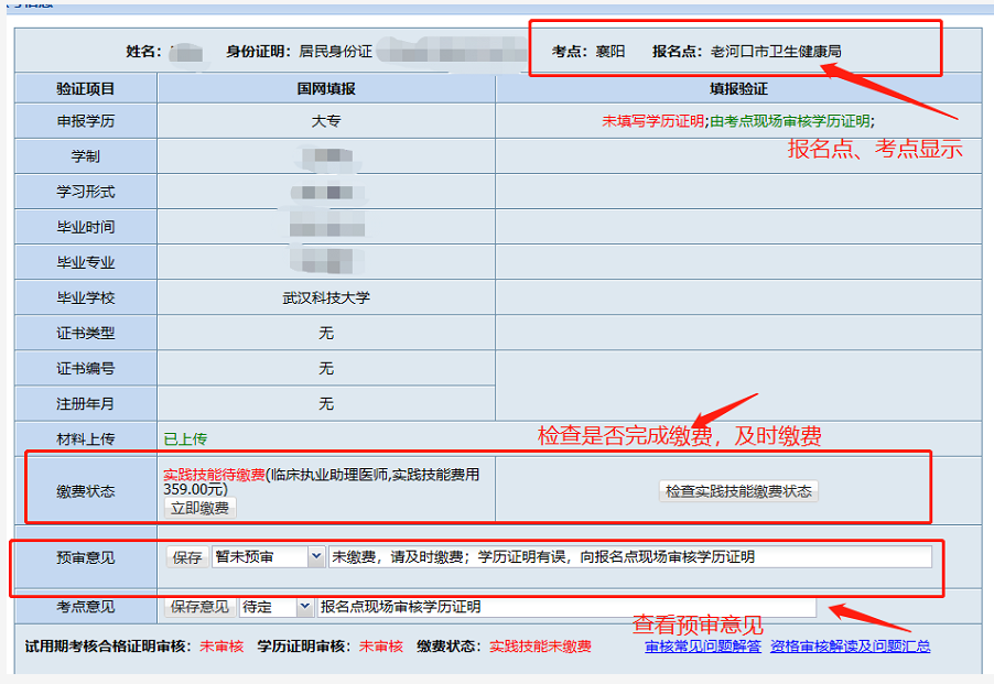 查看報名點(考點)、繳費狀態(tài)、預審意見位置(如下圖)