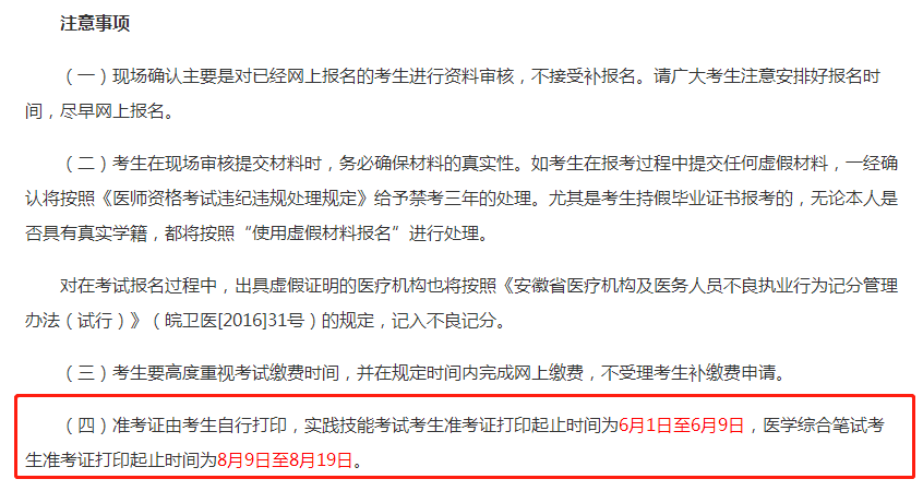 準(zhǔn)考證由考生自行打印,實踐技能考試考生準(zhǔn)考證打印起止時間為6月1日至6月9日,醫(yī)學(xué)綜合筆試考生準(zhǔn)考證打印起止時間為8月9日至8月19日。