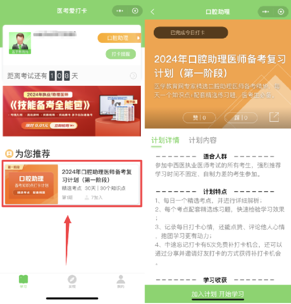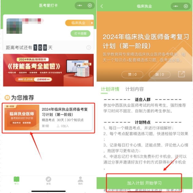 請(qǐng)選擇“您的備考計(jì)劃”,如口腔助理醫(yī)師備考復(fù)習(xí)計(jì)劃(第一階段),然后點(diǎn)擊下方“加入計(jì)劃開(kāi)始學(xué)習(xí)”按鈕,開(kāi)始正式進(jìn)入打卡學(xué)習(xí);