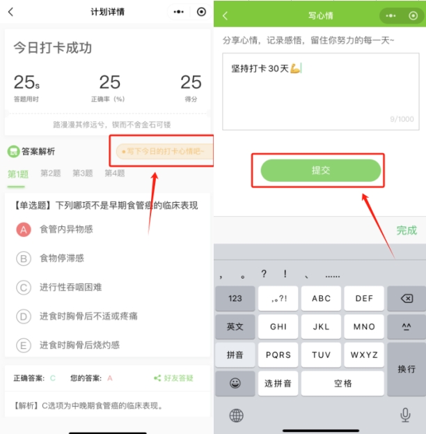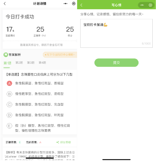 做完題后,可以查看每道題的解析和整體做題情況,然后點(diǎn)擊“分享今日打卡心情”,輸入您要記錄的內(nèi)容,提交即可完成打卡。