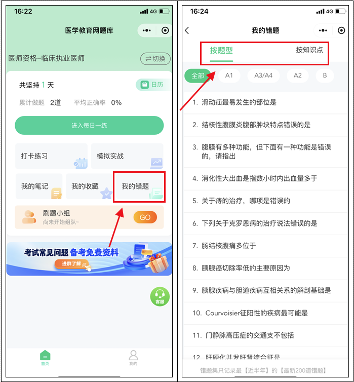 “我的錯題”中會顯示做題過程中的所有錯題,按“題型”及“知識點”分類。方便各位考生對于錯題再次查缺補漏。