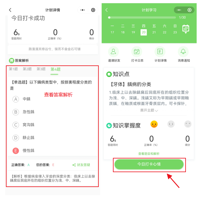 做完題后,可以查看每道題的解析和整體做題情況,進(jìn)入計(jì)劃頁面也可點(diǎn)擊“今日打卡心情”,輸入您要分享記錄的內(nèi)容,提交即可完成打卡。