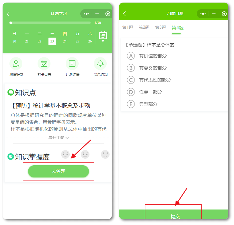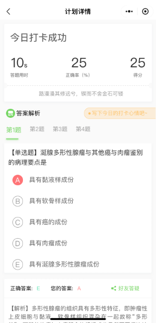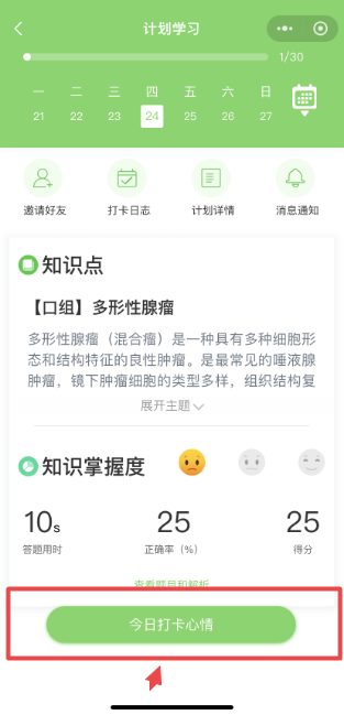 做完題后,可以查看每道題的解析和整體做題情況,進(jìn)入計劃頁面也可點擊“今日打卡心情”,輸入您要分享記錄的內(nèi)容,提交即可完成打卡。