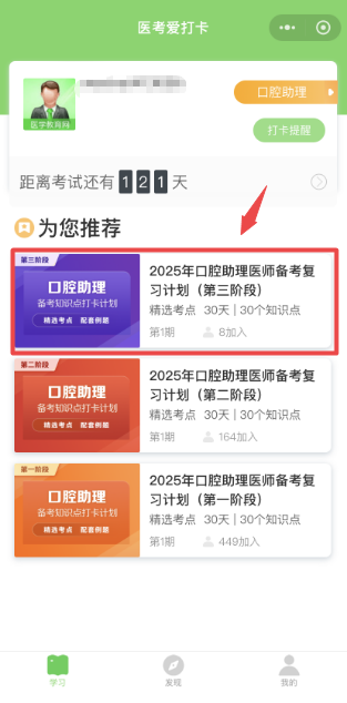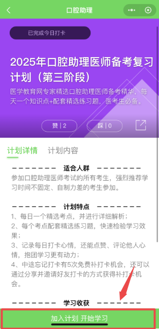 請選擇“您的備考計劃”,如口腔執(zhí)業(yè)醫(yī)師備考復(fù)習(xí)計劃(第三階段),然后點擊下方“加入計劃開始學(xué)習(xí)”按鈕,開始正式進(jìn)入打卡學(xué)習(xí);