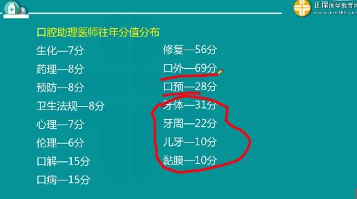 “口腔助理醫(yī)師筆試科目/出題占比及往年分值分布”的內(nèi)容,由醫(yī)學(xué)教育網(wǎng)編輯整理,更多口腔助理醫(yī)師考試復(fù)習(xí)資料、考試動(dòng)態(tài)、學(xué)習(xí)經(jīng)驗(yàn)技巧,敬請(qǐng)關(guān)注醫(yī)學(xué)教育網(wǎng)口腔助理醫(yī)師欄目。