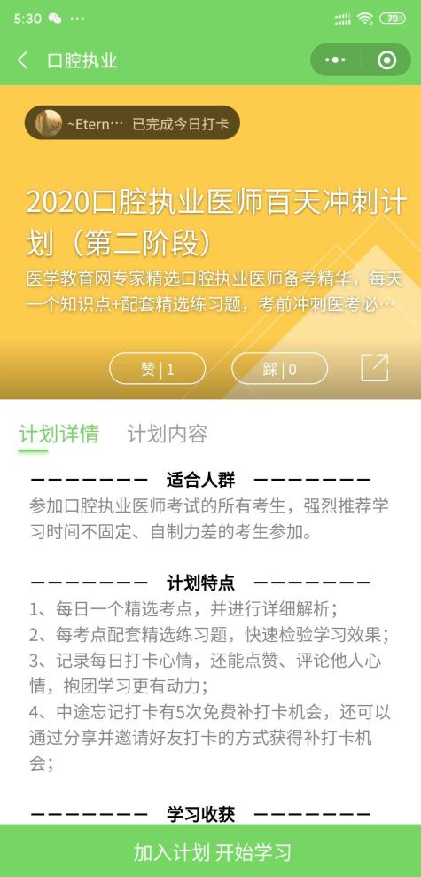 @參加口腔執(zhí)業(yè)醫(yī)師考試的所有考生!2020口腔執(zhí)業(yè)醫(yī)師醫(yī)考愛(ài)打卡第二階段已上線!每天進(jìn)步一點(diǎn)點(diǎn),距離拿證近一點(diǎn)!