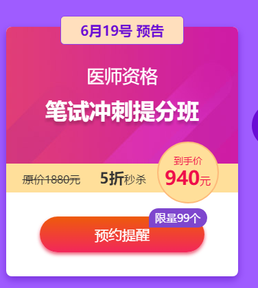 5折秒殺!!6月19日20:00口腔助理醫(yī)師筆試沖刺**班!原價(jià)1880,到手價(jià)940元!建議定個(gè)鬧鐘或者定制預(yù)約提醒,秒殺搶購(gòu)!
