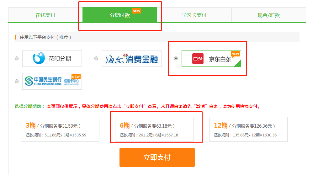 以下頁面僅供展示,具體分期費用請點擊“立即支付”查看。未開通白條請先“激活”白條,請勿使用快捷支付。