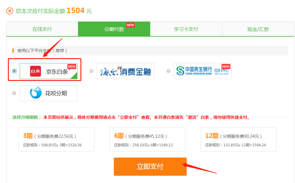 第三步:在支付頁(yè)面,選擇分期付款-京東白條進(jìn)行支付!