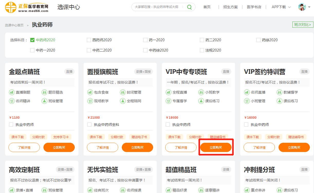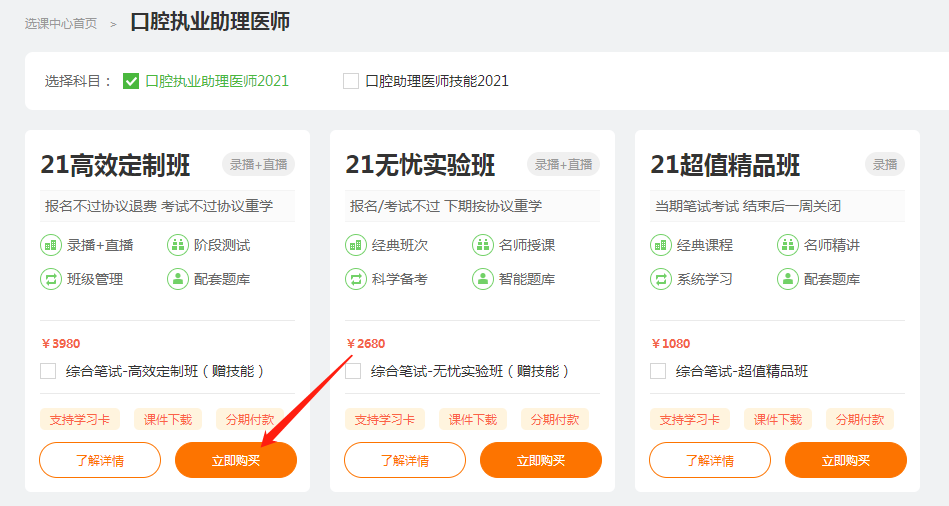 第一步:在選課中心選擇你想要的課程,點擊“立即購買”;選課中心>(以口腔助理醫(yī)師高效定制班為例)