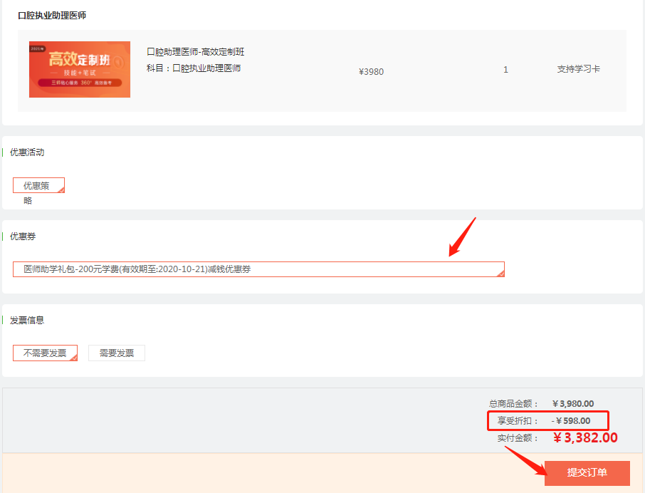第三步:點擊立即購買提交訂單即可,最終的價格為原價的9折-學費紅包的價格,以高效定制班為例,最終的到手價為3382元,相當于節(jié)省了598元。課程購買后即可登錄我的網(wǎng)校我的家學習啦,2021年課程贈送2020年輔導。