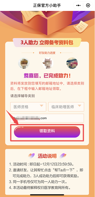 三、助力滿三人進(jìn)入領(lǐng)取頁面,輸入類別/郵箱,點(diǎn)擊“領(lǐng)取資料”,即可領(lǐng)取“學(xué)霸禮包”。