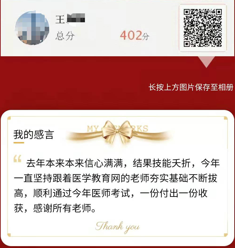 "助理,藥師,執(zhí)業(yè)醫(yī)師,都是報的咱的網(wǎng)課,今年陜西考區(qū)兩次延遲,老師們沒有放棄我們,一切努力終于喜獲可喜成績,感謝醫(yī)學(xué)教育網(wǎng),感謝感謝!"