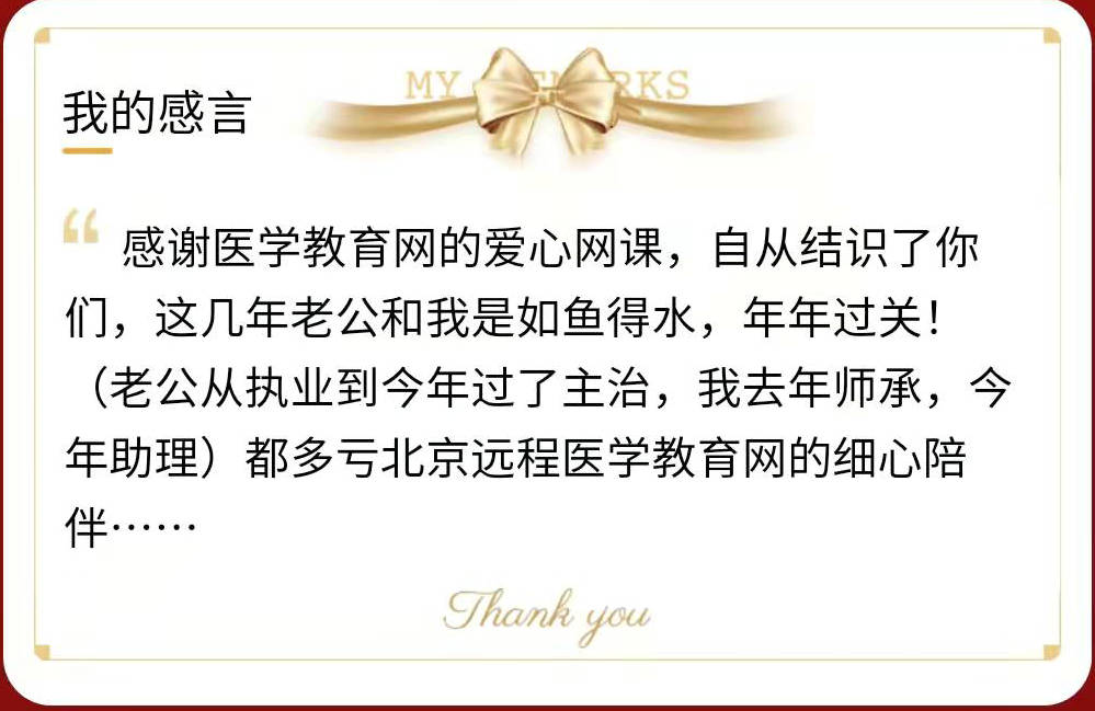 "感謝醫(yī)學(xué)教育網(wǎng)的愛心網(wǎng)課,自從結(jié)識了你們,這幾年老公和我是如魚得水,年年guo關(guān)!