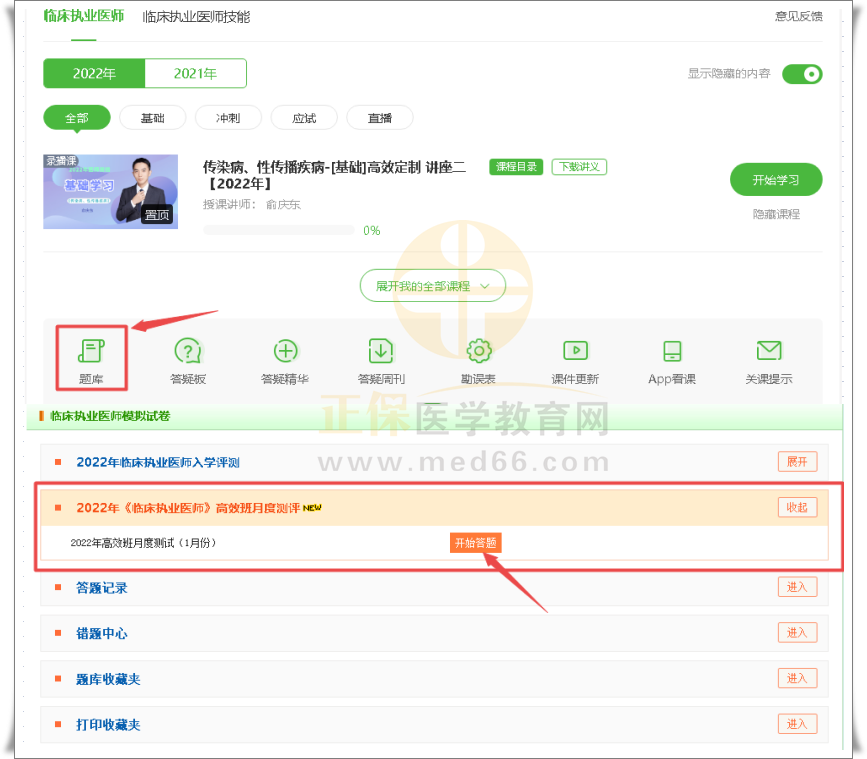 打開(kāi)【正保醫(yī)學(xué)教育網(wǎng)】,登錄賬號(hào)【進(jìn)入我的網(wǎng)校網(wǎng)的家】,點(diǎn)擊所報(bào)課程進(jìn)入,然后點(diǎn)擊【題庫(kù)】找到【月度測(cè)評(píng)】進(jìn)入。