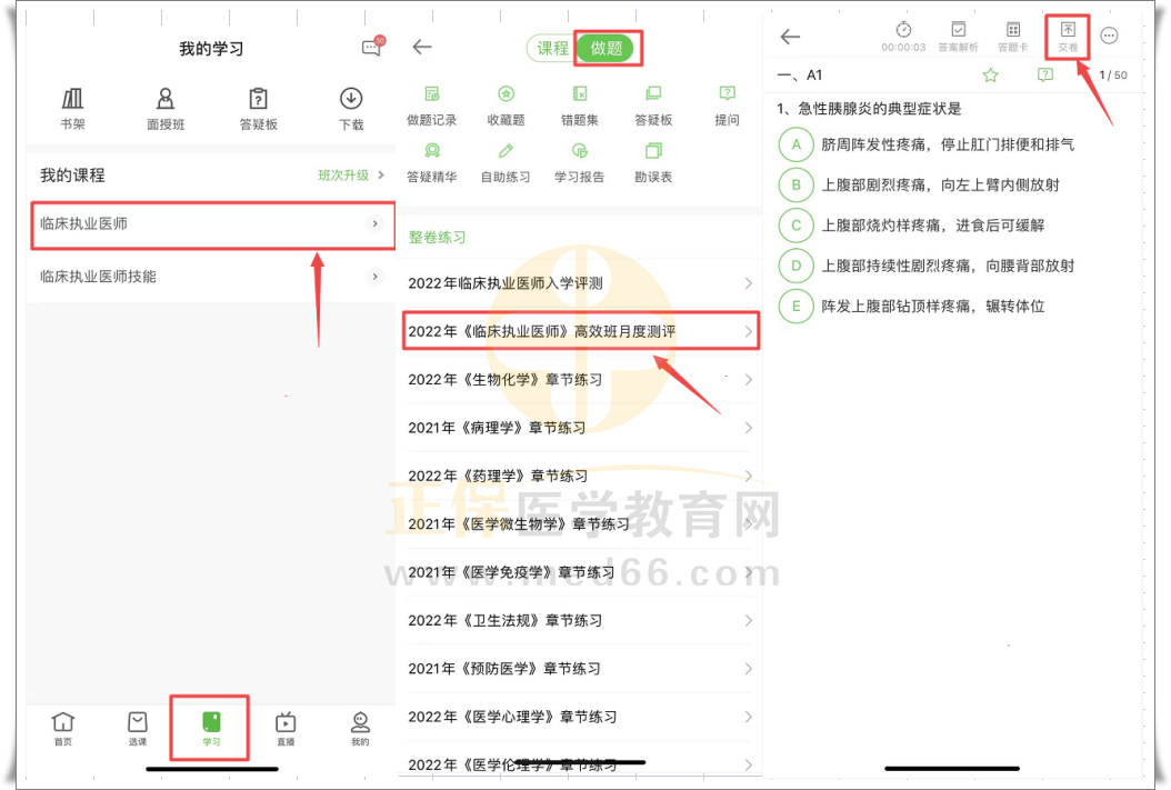 打開(kāi)【醫(yī)學(xué)教育網(wǎng)APP】,點(diǎn)擊底部【學(xué)習(xí)】入口,登錄賬號(hào)后,點(diǎn)擊所報(bào)課程進(jìn)入,然后點(diǎn)擊【做題】找到【月度測(cè)評(píng)】進(jìn)入。