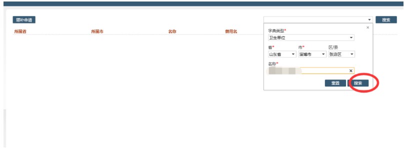3.在字典類(lèi)型中按要求填寫(xiě)工作單位或?qū)W校相關(guān)信息,點(diǎn)擊"搜索",確認(rèn)搜索不到結(jié)果后,并按要求填寫(xiě)相關(guān)信息,點(diǎn)擊左側(cè)“增補(bǔ)申請(qǐng)”。