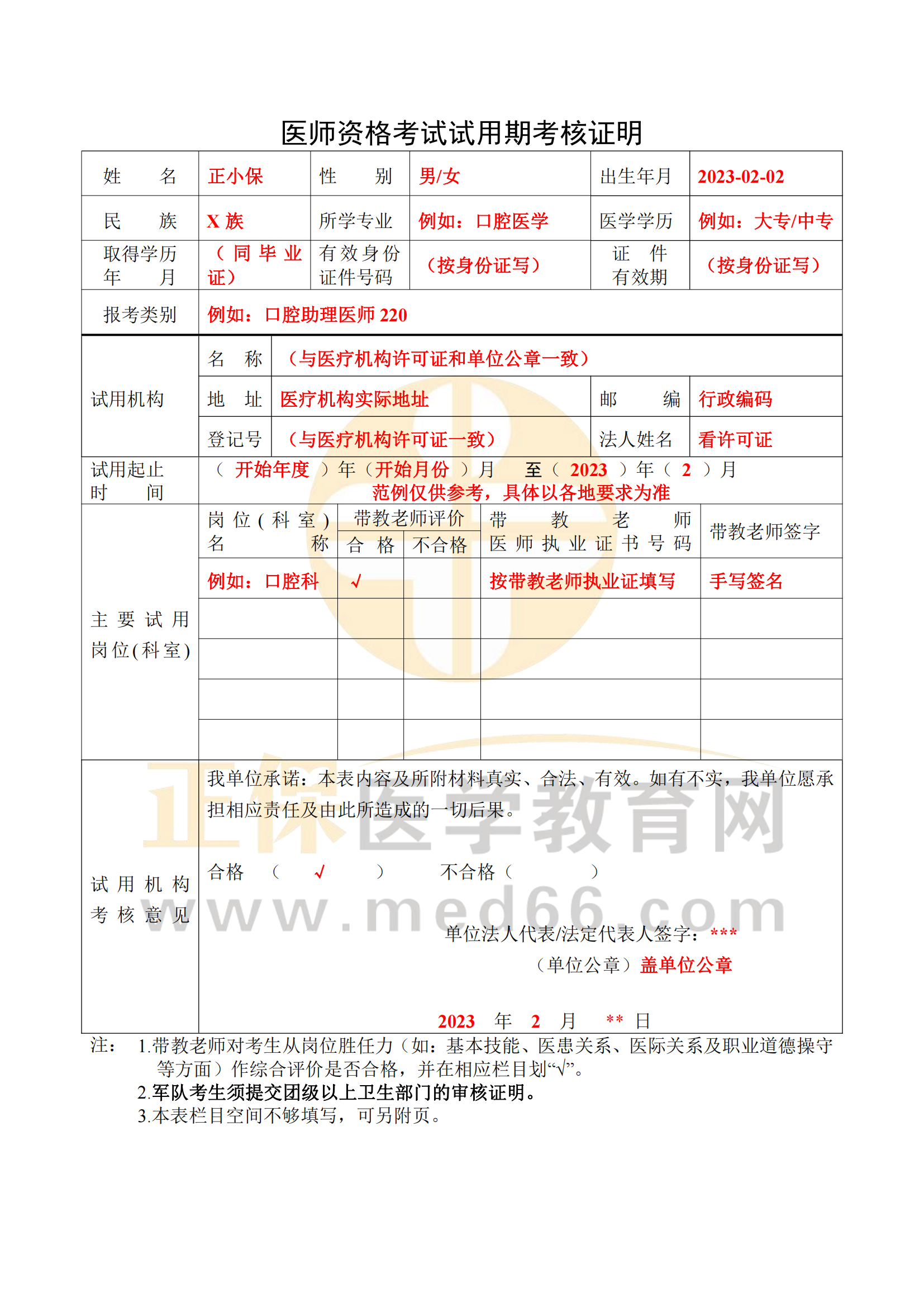 附件下載:醫(yī)師資格考試試用期考核證明(2023版)填寫范例