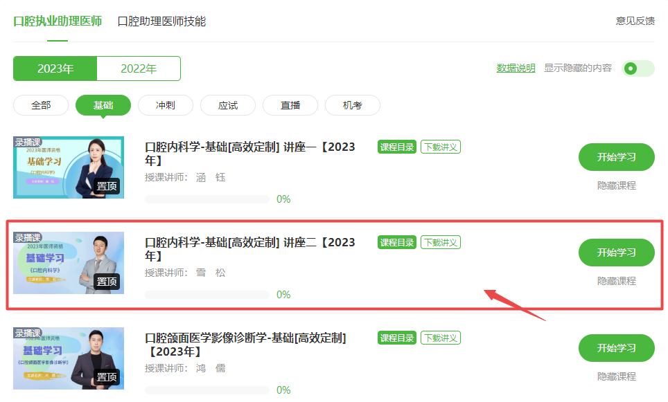 2023年醫(yī)師備考全面開啟!2023年口腔助理醫(yī)師基礎(chǔ)學(xué)習(xí)新課開通!目前由雪松老師授課的《口腔內(nèi)科學(xué)》科目課程已更新完畢!已購課同學(xué)可以直接進(jìn)入我的網(wǎng)校我的家-我的課程-口腔內(nèi)科學(xué)科目進(jìn)行學(xué)習(xí)!2023年口腔助理醫(yī)師《口腔內(nèi)科學(xué)》考試大綱/教材與2022年相比無變動,具體內(nèi)容下方查看。未購課學(xué)員點擊此處進(jìn)入選擇課程>,具體看課位置如下: