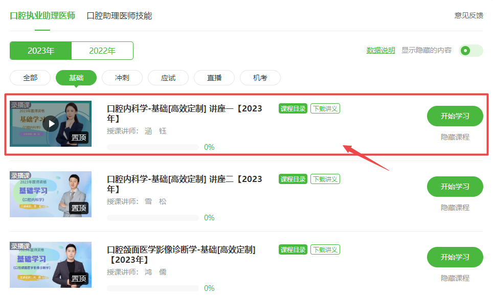 2023年醫(yī)師備考全面開(kāi)啟!2023年口腔助理醫(yī)師基礎(chǔ)學(xué)習(xí)新課開(kāi)通!目前由涵鈺老師授課的《口腔內(nèi)科學(xué)》科目課程已更新完畢!已購(gòu)課同學(xué)可以直接進(jìn)入我的網(wǎng)校我的家-我的課程-口腔內(nèi)科學(xué)科目進(jìn)行學(xué)習(xí)!未購(gòu)課學(xué)員點(diǎn)擊此處進(jìn)入選擇課程>>,具體看課位置如下: