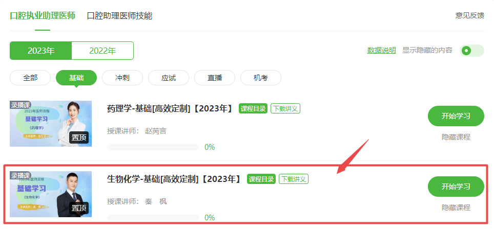 登錄學(xué)員代碼進(jìn)入我的網(wǎng)校我的家,點擊“我的課程”,進(jìn)入課程,選擇“2023年”,即可看到《生物化學(xué)》課程,點擊開始學(xué)習(xí)即可。