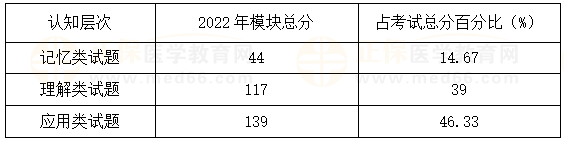 ①分析以上數(shù)據(jù)可以看出國家醫(yī)學(xué)考試要求的是全面的人才,尤其是“應(yīng)用類”人才,此類題目占總分的46.33%,從而分析出以后的考試趨勢也會越來越向“應(yīng)用類”人才靠攏。