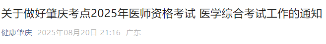 廣東肇慶2025年醫(yī)師資格綜合筆試考生速看考場地址及考生須知!以下為肇慶考點官方通知,請相關考生按時打印準考證,提前確認好考場安排及考生須知!