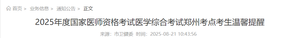 2.所有在鄭州考點(diǎn)各考場(chǎng)考試的考生,請(qǐng)?jiān)诖蛴?zhǔn)考證后,及時(shí)關(guān)注“健康鄭州”等微信公眾號(hào),獲取醫(yī)師資格考試期間最新消息,了解鄭州市內(nèi)外交通情況,提前規(guī)劃赴考場(chǎng)路線和出發(fā)時(shí)間,以免影響參加考試。