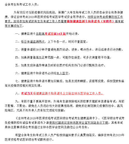 吉林考點(diǎn)2020年國家醫(yī)師資格考試醫(yī)學(xué)綜合考試考前通知