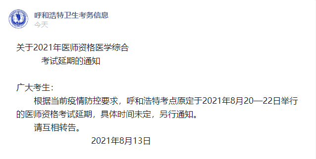 近期疫情反復(fù),今日國(guó)家衛(wèi)健委發(fā)布公告2021年醫(yī)師資格考試推遲舉行!呼和浩特考點(diǎn)也公布了延期通知,具體內(nèi)容如下: